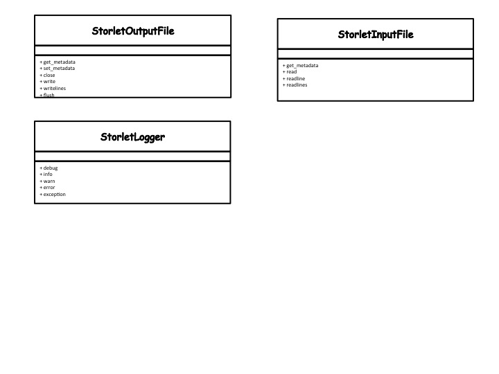 Below is a class diagram illustrating the classes behind the in_files, out_files, and logger. The diagram lists only the methods that the storlet writer is expected to work with.